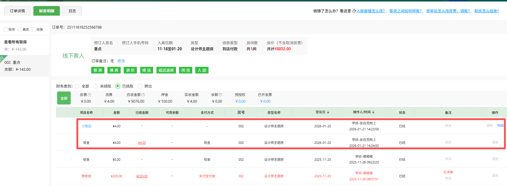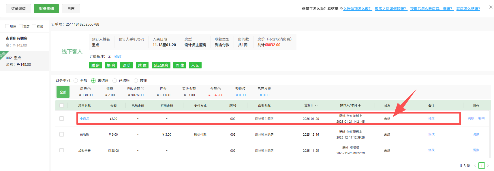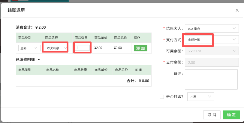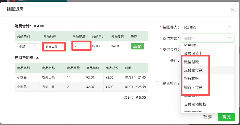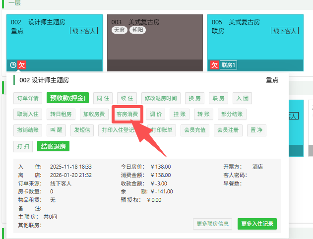 订单内客房消费操作 当房间客人有【客房消费】需要操作录入客房消费和收款情况。点击 实时房态页面,鼠标放对应的房间, 点击弹出层“客房消费”按钮,进入界面,如下图:1、录入客房消费,未收款选择“商品名称”、“商品数量”,支付方式--余额挂账客房消费录入成功后,显示小商品消费未结账,财务明细显示如下图: 2、录入客房消费,并收款选择“商品名称”、“商品数量”,选择实际支付方式,比如微信付款、支付宝付款等客房消费录入成功,并收款后,显示小商品消费已结账,财务明细显示如下图: 该文章对您有帮助吗? 是 | 否